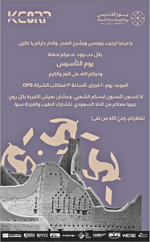 K-Corp is hosting a Founding Day Celebration in Jeddah and Riyadh on Thursday, February 20, at 3:00 pm at their OPS offices. Come dressed in traditional Saudi attire and bearing Saudi sweets!